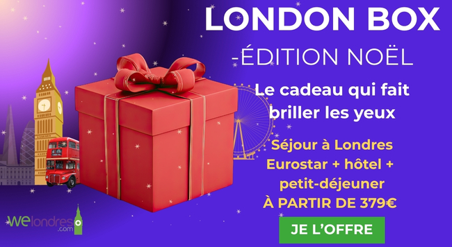 Pour un anniversaire, une fête, Noël ou simplement une surprise, WeLondres.com a créé les London Box, un coffret unique intégrant là encore l'hébergement dans l'Inner London, le petit-déjeuner et le transport. Il vous suffit de commander la box qui vous convient pour l'offrir à la personne de votre choix ou en profiter vous-même. Valable un an, la London Box est un cadeau hors norme qui rencontre un succès phénoménal. À vous les balades dans Oxford Street ou le long de la Tamise, dans Westminster ou les quartiers branchés tels Camden Town, Kensington, Brixton, Hampstead ou le fabuleux Notting Hill où vous pourrez revivre les scènes excentriques du film qui a vu Julia Roberts et Hugh Grant se promener le long des rues de ce district mémorable. Sans oublier les indémodables relèves de la garde à Buckingham Palace.